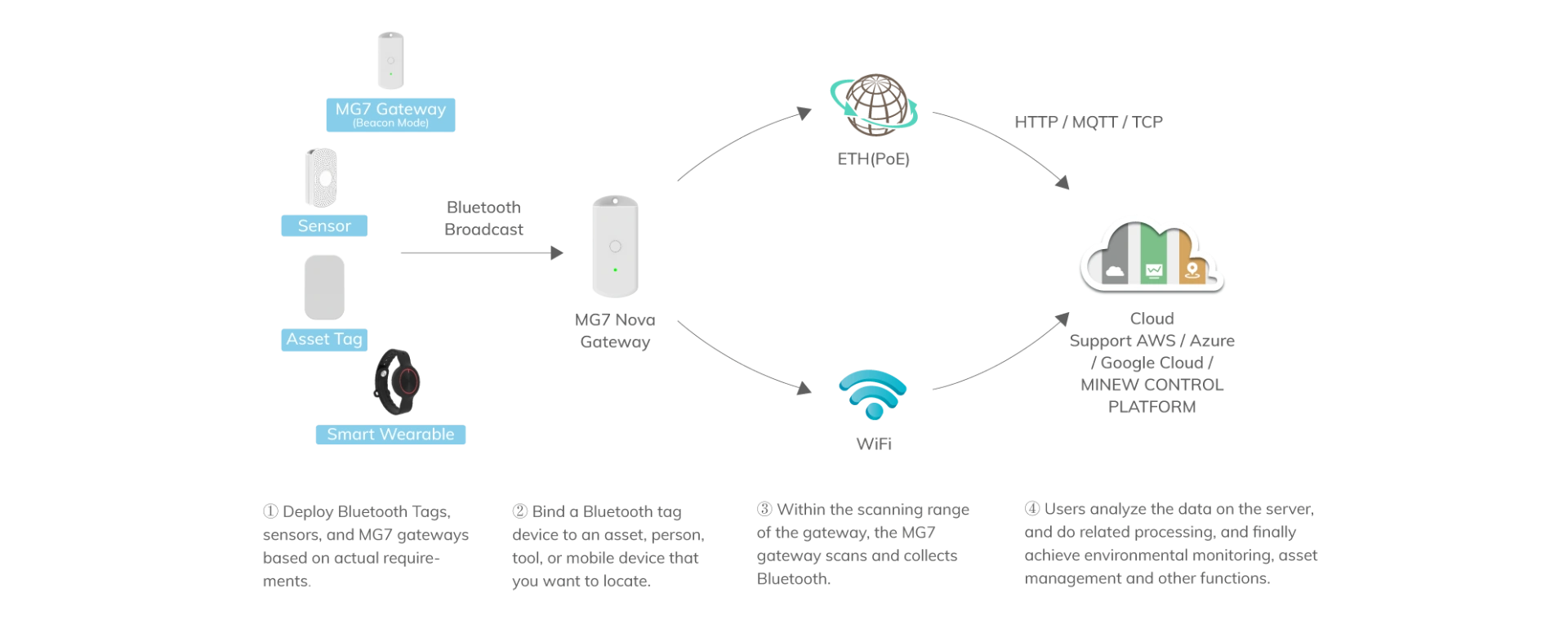 MG7은 지속적인 연결을 위해 PoE 또는 Wi-Fi를 활용합니다., 스캐닝 게이트웨이와 브로드캐스팅 비콘 간을 원활하게 전환합니다..